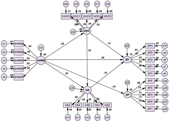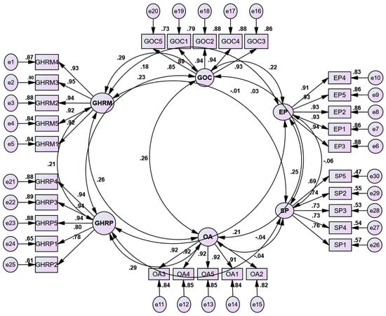 The GHRM measurement model was confirmed using a second-order CFA as well as a first-order CFA. Some modifications were performed according to the suggested modification indices. Figure 2 shows that a good model fit was found. All the items in the present research had values of less than 4 for kurtosis and less than 2 for skewness. Given that the present study’s sample size was more than 200, major deviations from normalcy may be inconsequential and have had little effect on the findings []. There was a 0.904 Kaiser–Meyer–Olkin measure of sampling adequacy. There were also five GHRM constructs found through the factor analysis (Table 5). The factor loadings of the items for GHRM ranged from 0.930 to 0.965, those for GOC ranged from 0.886 to 0.962, those for OA ranged from 0.898 to 0.936, and those for EP ranged from 0.920 to 0.949. SP included five items with factor loadings that varied from 0.751 to 0.818. Table 6 shows the measurement model’s total fit statistics, which include a chi-squared with 286 degrees of freedom X2/df = 1.854, GFI = 0.981, CFI = 0.981, TLI = 0.979, NFI = 0.955 and RMSEA = 0.044, which indicate appropriate model fit [].