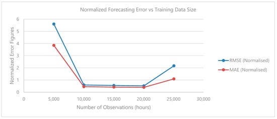 On determining the optimal data size for training, a fixed set of 50,000 data points that was separate from the training data was utilized. The MATLAB ‘randperm’ function was used to procure random data entries without repetition for both building and grid iterations. The normalized RMSE and MAE values were then used to assess the magnitude of change in forecasting performance by varying the dataset sizes used for training.