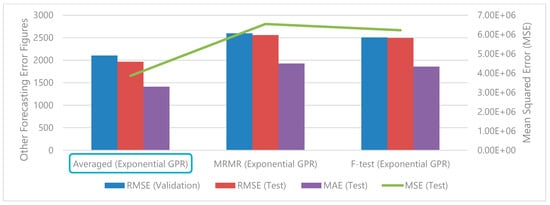 where n = summation iteration, A = actual value, and F = forecast value. The MAE value measures the amount of error. The RMSE corresponds to the standard deviation of errors and the MAPE evaluates the effect of the actual values magnitude. For all these metrics, a lower value translates to a more accurate forecasting model [].