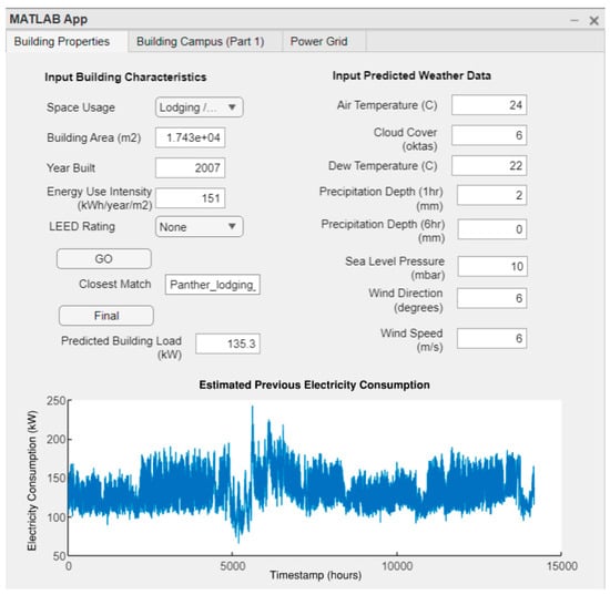 Figure 11 displays a screenshot of the interactive GUI created for the building classification system using MATLAB. Users are prompted to enter building characteristics and forecasted weather data, which are then used to predict the final electric load in kW. Additional functionalities related to the case study are presented in separate tabs within the GUI window.