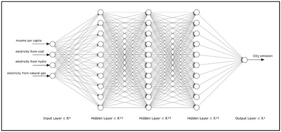 The second method used in this study for the modeling of the CO2 emission is deep learning networks. Deep learning is a machine learning model where multiple hidden layers are employed to increase the training accuracy [64]. The deep learning approach is selected for its ability to capture complex nonlinear relationships in large datasets, offering a robust and flexible alternative to conventional models, while fully utilizing the available labelled data. In this study, multilayer perceptron (MLP)-type neural networks [65] with multiple hidden layers are utilized as the deep learning network. Activation functions of the network are selected as tangent hyperbolic functions. The developed deep learning network is shown in Figure 1.
