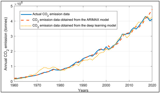 As can be seen from Table 3, both ARIMAX and deep learning methods can be utilized to model the annual CO2 emission data dependent on the income per capita and electricity consumption from coal, hydroelectric and natural gas resources for Turkey in the period of 1960–2020. Considering the coefficient of determination and other performance parameters, it is observed that the deep learning model provides better performance compared to the ARIMAX model for modelling the annual CO2 emission data especially in the pandemic period of 2019–2020. It can be argued that either the ARIMAX model or the deep learning model can be used to model the annual CO2 emission data, providing insights for the estimation of the future emission data dependent on the income per capita and electricity usage, which would help to achieve the goals regarding the reduction in the carbon footprint according to the Paris Agreement.