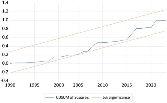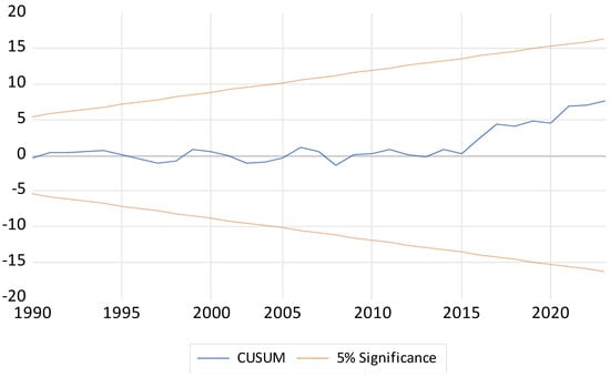 where is the dependent variable and is a vector of exogenous variables. The null hypothesis, which is tested by setting the coefficients of the lagged level variables in Equation (10) equal to zero , states that and are not cointegrated. By providing upper and lower bounds for the critical values, ref. [] proposed the critical values for testing the null hypothesis that there is no cointegration. The null hypothesis indicates no cointegration if the given test statistics exceed upper bounds critical values; if they fall below lower bounds critical values, the null hypothesis is not rejected. If the cointegration lies between the upper and lower boundaries of the critical values, it is considered indecisive. It is implied that there is no cointegration between and when the null hypothesis is rejected.