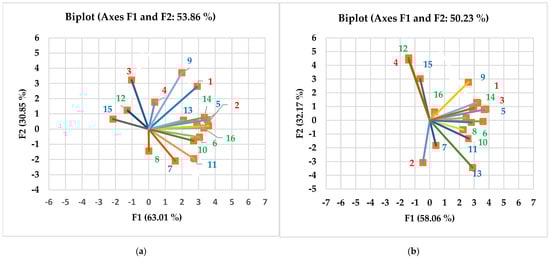 The representation in the PC1 × PC2 plans of the variables corresponding to environmental factors and potato traits as a function of agricultural inputs, in the Redsec and Roclas potato varieties, under mineral fertilization: (a) mineral fertilization; (b) organic fertilization. 1—temperature, °C; 2—relative air humidity, %; 3—wind velocity, m/s; 4—precipitation, mm; 5—Redsec potato yield, conventional treatment; 6—Redsec potato yield, treated with 4% A. cepa; 7—Redsec dry matter, conventional treatment; 8—Redsec dry matter, treated with 4% A. cepa; 9—Redsec starch accumulation, conventional treatment; 10—Redsec starch accumulation, treated with 4% A. cepa; 11—Roclas potato yield, conventional treatment; 12—Roclas potato yield, treated with 4% A. cepa; 13—Roclas dry matter, conventional treatment; 14—Roclas dry matter, treated with 4% A. cepa; 15—Roclas starch accumulation, conventional treatment; 16—Roclas starch accumulation, treated with 4% A. cepa.