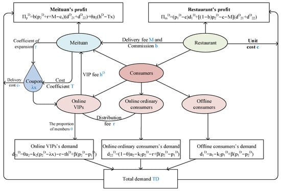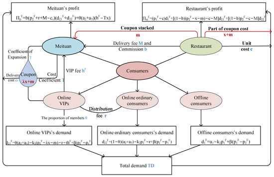 There are three types of consumers: online VIPs, online ordinary consumers, and offline consumers. The total number of online consumers is , among which those a ratio are VIPs and the rest are ordinary consumers. Related to the sales volume and the number of potential consumers in each channel, the meal price after using the coupon, the coupon price, the delivery fee, and the reference price, the demands of the three types of consumers are , , and , respectively.