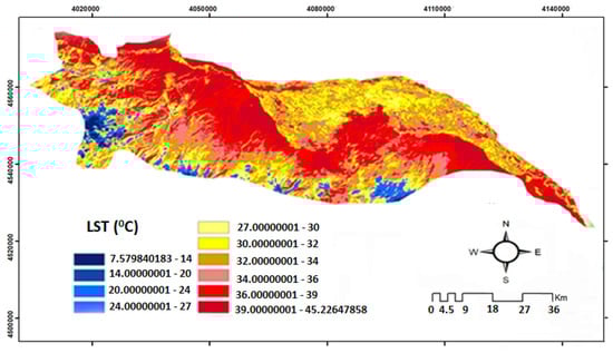 | Land Surface Temperature | Very Hot (36–45.2 °C) | Hot (32–36 °C) | Normal (27–32 °C) | Cool (14–27 °C) | Very Cool (7–14 °C) |
