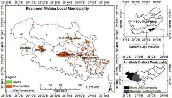 The study was conducted in Raymond Mhlaba Local Municipality (RMLM) in the Eastern Cape Province of South Africa (Figure 1). Raymond Mhlaba Local Municipality (RMLM) is in Amathole District Municipality in Eastern Cape Province. The municipality has a total population of 127,115, with the majority residing in villages, with an unemployment rate of 48.10% [24]. The municipality has a rainfall range of 43 mm, with the lowest at 19 mm, and a temperature range of 24 °C, with the lowest at 5 °C [25]. The selection of the study location within the municipality was based on the prevalence of numerous livestock farmers, a well-defined communal area for grazing and browsing, and the predominant reliance of most farmers on livelihoods derived from both livestock and crop farming [26,27]. And the area is dominated by farmers who farm cattle, sheep, and goats, using livestock farming as their source of income, and for some it is a primary and to others is a second source of income. This study adopted a longitudinal pooled cross-sectional design to investigate the specified aspects.