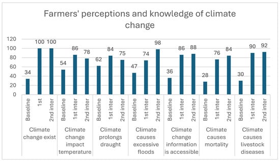 Figure 3 shows the baseline, first intervention, and second intervention with seven perceptions as indicated in the figure below. In the baseline with the perception of having heard anything about climate change, 34% indicated that they had heard about climate change. With the first and second interventions, a total of 100% mentioned that they had heard about climate change. About 54% noticed the change in temperature at baseline, 86% noticed temperature changes in the first intervention, and 78% on the second intervention. Ref. [45] also agrees that most farmers notice climate change due to abnormal weather patterns. However, the results also indicated that from the initial phase, most respondents were not aware of climate change but became more understanding of the phenomenon from the establishment of the farmer field school. This is also in agreement with [31], who argued that farmer field schools play an important role in making farmers understand the effects of climate change by improving knowledge and awareness. In terms of the perception on prolonged draught, about 62% at the baseline and 84% and 75%, respectively, in the first and second interventions, farmers noticed some changes. About 47%, 74%, and 98% noticed excessive floods in the three stages of intervention, respectively. The literature also suggests that farmers are faced with complicated challenges such as drought and excessive floods at times, which results in low production [31]. With regards to the perception of farmers’ access to climate change information, the results show that about 36% of respondents at the baseline, 86% at the first intervention, and 88% at the second intervention had access, which may suggest that indeed the establishment of FFS did have a positive impact on farmers’ view and understanding of climate change. Furthermore, about 28% on the baseline noticed mortality due to climate change, with 76% in the first intervention and 84% in the second intervention. About 92% noticed diseases due to climate change, followed by 90% and 30% at the baseline. Overall, the figure depicts that at the baseline, the respondents were less than 55%, and the percentage increased when there was the first intervention and kept on increasing in the second intervention. The percentage of the respondents who perceived change in both temperature and rainfall in the current study was higher, implying that the level of perception is increasing gradually. These findings are similar to [46], who found that experiencing a higher frequency of drought in the past increases farmers’ perception of climate change.
