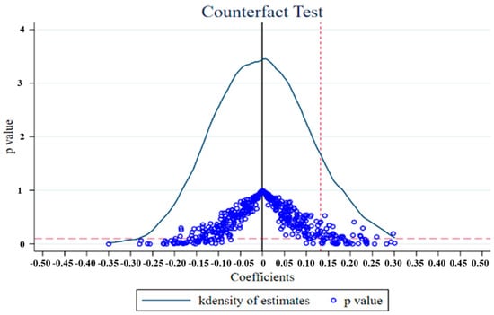 As shown in Figure 1, the vertical dashed line at x = 0.1401 signifies the actual estimated coefficient derived from the baseline regression analysis utilizing the M2-OLS methodology. The horizontal dashed line at y = 0.1, on the other hand, denotes the threshold for statistical significance, as indicated by the p-value boundary. From the regression results of 500 simulations, Figure 1 shows that the results estimated by the randomized year placebo test are significantly different from the actual estimated coefficient, and most of the p-values represented by the small circle are above 0.1. The above results indicate that the selection of occurrence time nodes for ETS in the basic study is not accidental, strengthening the robustness of the estimated results.