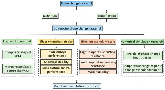 Based on the current results of research into PCMs, this review systematically introduces the definition, classification, and selection of PCMs and summarizes the composition methods of CPCMs and their impact on the performance of asphalt binders and asphalt mixtures, including their thermoregulatory properties, chemical stability, and temperature stability. Finally, based on the phase change theory for asphalt pavement temperature, the state-of-the-art is reviewed. The research content is shown in Figure 1. This review aims to provide guidance for the application of PCMs in asphalt pavements, so as to promote the sustainable development of high-quality pavements.