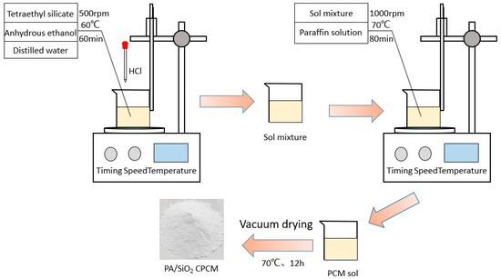 Li [83] created shaped PA/SiO2 CPCMs and observed that the paraffin was uniformly dispersed throughout network by using scanning electron microscopy; the preparation principle is shown in Figure 3. Jin [84] used the vacuum impregnation method to prepare a composite conformal PCM with diatomite (DI) as the support material and stearic acid (SA) and palmitic acid (PA) as eutectic binary fatty acids. The results yielded the largest quality ratio of 65.2% for (SA + PA) eutectic absorbed in DI. The microscopic morphology and properties of CPCMs were also described using scanning electron microscope (SEM). Zhou et al. [85] prepared CPCMs using porous ceramics as a support carrier and found that they had a high adsorption rate for paraffin, but still tended to leak liquid-phase PCMs due to the small pore size. Huang et al. [86] used expanded perlite as a shaped material and a sodium acetate trihydrate–formamide mixture as a PCM to prepare composite shaped PCMs. It was shown that expanded perlite could adsorb 55 wt% of the PCM without leakage. The melting point of the CPCM was 40.5 °C, the latent heat was as high as 148.3 J/g, and the temperature conductivity was 0.0978 W/(m·K).