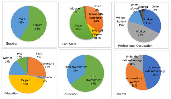 Of the total of 197 respondents, all over 18 years of age who agreed to answer the questionnaire anonymously and voluntarily, 115 are women and 82 are men. The average age of the interviewees is 35 years old, with the youngest interviewee being 18 years old and the oldest being 78 years old. A large number of the respondents are single, with 107 individuals, and those married or in a civil union total 70 individuals. Regarding professional occupation, 93 are workers, 64 are students and 29 are working students. The sample is composed of 92 graduates, 49 with secondary education, 28 with masters, and 20 with doctorates. Most respondents, more precisely 127 individuals, reside in urban areas, and 70 individuals reside in rural areas. Finally, concerning income, 83 respondents consider that they receive an income above the national average (1500 euros for the year 2024), 67 consider that they receive an income equal the national average, and 47 individuals consider that they receive an income below the national average. Figure 2 represents the socioeconomic and demographic characteristics of the sample of respondents to the questionnaire in this study.
