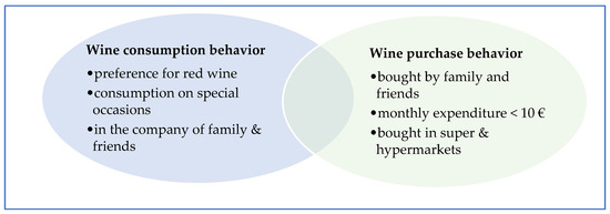Regarding wine consumption behavior, regardless of whether it is sustainable or not, most respondents are characterized by consuming red wine (45.2%), followed by white wine (31.5%), with fortified wines (2%) being the least consumed. Most respondents declare consuming wine only a few times a year (43.1%), particularly on special occasions (80.7%), and in the company of family (74.6%) and friends (81.7%). Regarding the purchasing behavior of respondents, the majority declare that the wine they consume is bought by family and friends (62.5%), with only 37.5% buying the wine they consume: 23.4% state that their monthly expenditure on wine purchasing is less than 10 euros, 15.7% incur a monthly expenditure between 10 and 19 euros, and 65.1% buy wine in super and hypermarkets. It is also important to highlight that the majority (57.9%) consider that their level of wine knowledge is very weak, or weak. Figure 3 highlights the main characteristics of the sample in terms of their wine consumption and purchasing behavior.