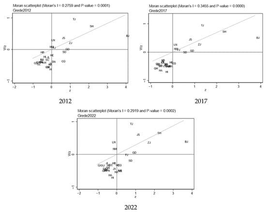 where, is the green development level of the province (municipality directly under the central government) in year t, , , and are the spatial lag terms of the explanatory variables, explanatory variables, and control variables, respectively, W is the spatial weight matrix, and is the spatial autoregressive coefficient. is the control variable, is the coefficient corresponding to the core explanatory variables, and is the influence of the region on the neighborhood. is the control variable. is the coefficient corresponding to the core explanatory variable, and is the influence of the region by its neighbors. is the spatial fixed effect, is the time fixed effect, and is the error term. This paper focuses on exploring spatial relationships by constructing an economic distance matrix W. The spatial weight matrices used in the empirical evidence are normalized.