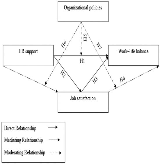 Drawing from these theoretical perspectives, we anticipate that job satisfaction mediates the relationship between HR support and WLB. According to the WFBT, satisfied employees are better equipped to handle the demands of both work and family roles, resulting in an improved WLB. HR support enhances job satisfaction, which, in turn, facilitates better integration of work and family domains. Furthermore, we expect organizational policies to moderate the relationships between HR support, job satisfaction, and work–life balance. Supportive and progressive policies can amplify the positive effects of HR support by providing an environment that nurtures employee well-being. For example, flexible work policies can enhance the impact of HR support on WLB by allowing employees greater control over their schedules. This crucial hypothesis, which aligns with the conceptual model in Figure 1, captures the complex relationships between HR practices, job satisfaction, and organizational policy. It emphasizes the need to take cultural and gender-specific variables into account when developing HR efforts to improve Saudi women’s WLB.