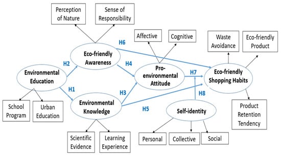 We have developed a research conceptual framework based on the hypotheses proposed by this approach, as depicted in Figure 1. The figure presents a structural model that examines the interrelationships among various factors that influence eco-friendly shopping habits. It demonstrates how environmental education, influenced by school programs and urban education, enhances environmental knowledge and eco-friendly awareness, subsequently impacting pro-environmental attitudes. Pro-environmental attitudes are shaped by both affective and cognitive components and directly influence eco-friendly shopping habits, encompassing waste avoidance, a preference for eco-friendly products, and product retention tendencies. Additionally, self-identity, influenced by personal, collective, and social factors, also contributes to pro-environmental attitudes and eco-friendly shopping habits. The model’s hypotheses (H1–H8) illustrate the expected causal pathways among these constructs.