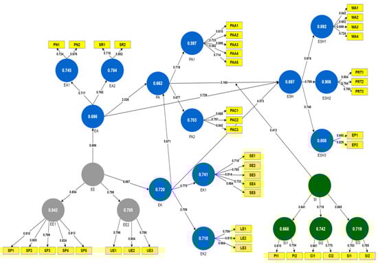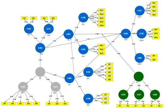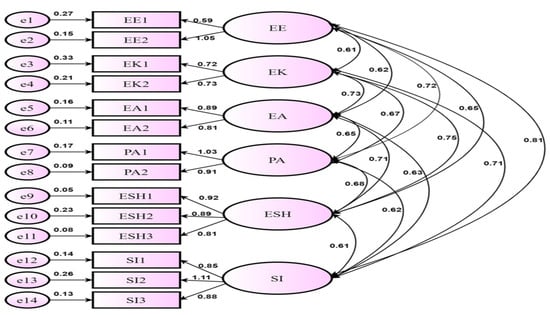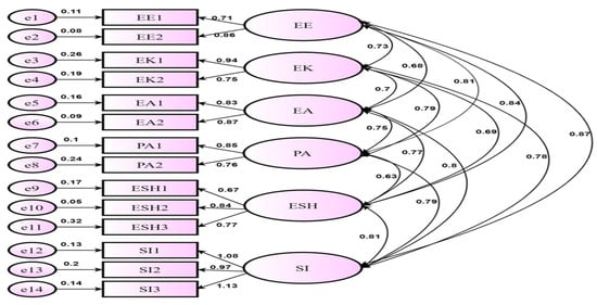 Convergent validity is a measure used to assess whether multiple indicators of a construct are in agreement or converge on the same underlying concept. It is an essential aspect of construct validity in structural equation modeling (SEM). The factor loadings of items on their respective constructs are key indicators in assessing convergent validity. Factor loadings are one of the key components of convergent validity. Factor loadings are the coefficients that represent the relationship between observed variables (indicators) and their underlying latent construct. For convergent validity to be established, factor loadings should typically be greater than 0.70 [49]. This indicates that the indicator shares more variance with its associated construct than with error. Higher factor loadings suggest that the indicator is a strong representative of the latent construct. The results are shown in Figure 2 and Figure 3.