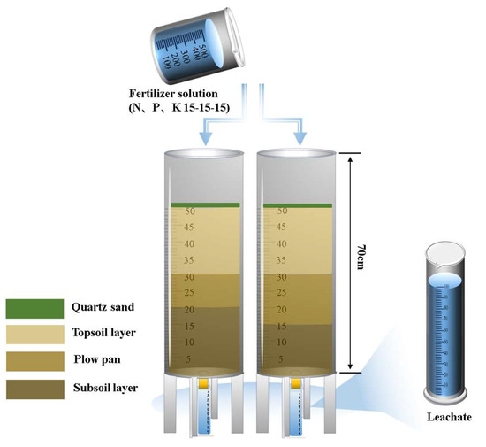 A soil leaching test was conducted in an acrylic column (70 cm height × 10 cm diameter), which had a channel in the bottom center for leachate outflow (Figure 1). The air-dried soil was placed in the column to a height of 50 cm. All topsoil layers were 20 cm thick, and the plow pans had different heights and bulk densities. The experiment involved 6 treatments (Table 1) with 3 replicates, totaling 18 soil columns. We calculated the mass of the different soil layers with various bulk densities and heights; then, we compacted the soil with 60% of the maximum field water capacity in a separate column, which had a height of only 30 cm and from which the soil layers could be easily removed. Then, the soil layers were loaded into the column. Quartz sand with a height of 1 cm was placed on top of the topsoil to prevent the soil from being washed away. After the soil columns were filled, they were left to sit for 12 h before drip irrigation. According to the application rate of nitrogen fertilizer at 150 and 300 kg hm−2, a low volume (LV) (392.5 mL, reaching a height of 5 cm in the column) of a fertilizer solution of N: P: K = 15:15:15 was applied to the soil column, and then a high volume (HV) (785.0 mL, reaching a height of 10 cm in the column) of the fertilizer solution was applied after two weeks. During this process, leachate was collected at various intervals until no water dripped for 2 h. After completing the leaching experiment, soil samples were collected according to the soil layers. The soil samples were air-dried and ground to 2 mm for a chemical analysis.