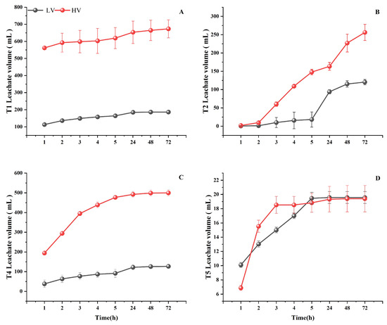 The leachate volume was saturated at 72 h in all treatments (Figure 2). The leachate volumes in the T1 and T4 treatments with the addition of the HV fertilizer solution were 261.0% and 113.0% higher than those with the addition of the LV fertilizer solution, respectively (Figure 2A,C).