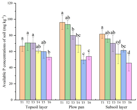 Figure 5. Available P concentrations in different soil layers. Note: different letters above the error bars indicate significant differences in the same soil layer (p < 0.05).