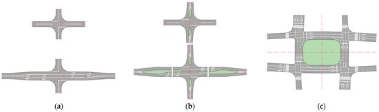 The adopted division of intersection types: (a) simple intersections; (b) channelized intersections; (c) rotary intersections [40].