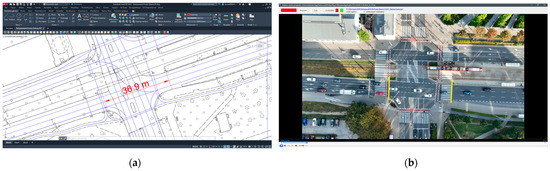 The measurement section as the observation base consisted of the section from the pedestrian crossing at the intersection entrance to the section from the pedestrian crossing at its exit for a specific relation. Speed measurement registration was based on noting the time a specific vehicle passed through the measurement base. The segment length was determined using a digital map of the given intersection along the lane axis. Figure 2 shows the data reading process for a selected intersection in Warsaw. The segment length was determined with an accuracy of 0.1 m, and the travel time with an accuracy of 0.1 s.