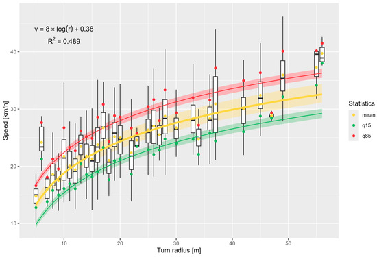 Simplified model of speed dependence depending only on radius, together with confidence intervals for the determined statistics. Color marks: red—0.85 quantile, yellow—mean, green—0.15 quantile. Boxplots—speed measurement results for individual radii.