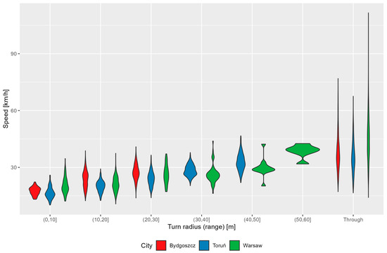 The cities selected for this study vary in size. Warsaw, the capital and largest city in Poland, has over 1.8 million residents. Toruń and Bydgoszcz are medium-sized provincial cities, with populations of approximately 330,000 and 195,000, respectively. These cities also differ in terms of socio-economic development. The study showed variations in the implementation of traffic solutions among these cities. However, statistical tests for individual factors were conducted without distinguishing between cities. This approach aims to obtain results applicable to traffic signal design across the entire country. The influence of a city’s size or the nature of its land use, and perhaps even its degree of socioeconomic development, is a necessary direction for further research. Figure 4 illustrates the differences in speed results for different turning radii classes and for through movements at intersections. The results were analyzed using statistical methods and visualizations of selected speed distribution functions.
