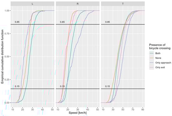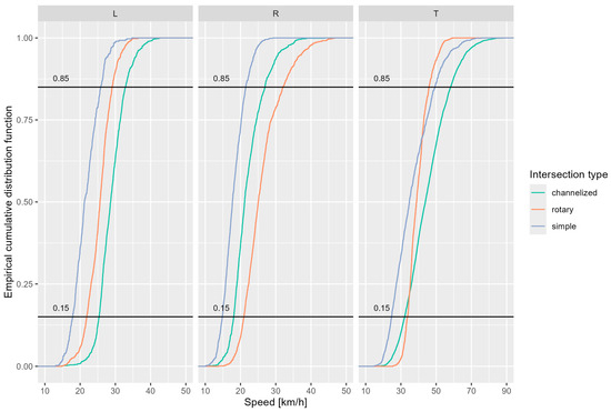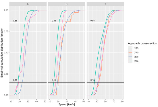 Dependence of speed on the cross-section type at the intersection approach (L—left, R—right, T—through).