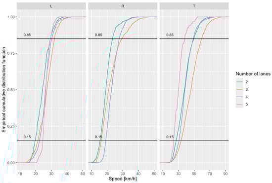 Dependence of speed on the number of lanes at the intersection approach (L—left, R—right, T—through).