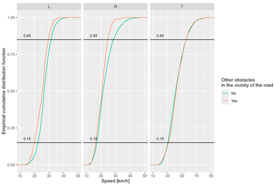 Dependence of speed on the other obstacles in the vicinity of the road (L—left, R—right, T—through).