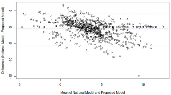 Bland–Altman plot for comparing the results of calculations by the national method [1] using a constant speed of 50 km/h and the values from model (1), along with an indication of the mean difference (blue line) and the range of ±1.96 standard deviation of these differences (red lines).