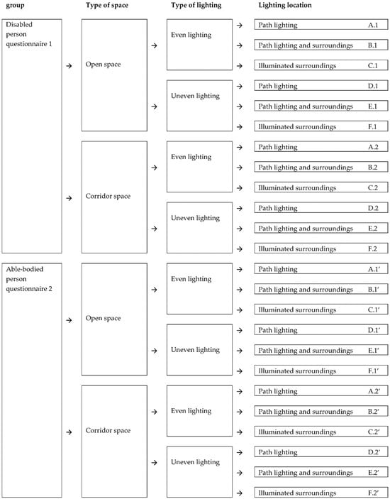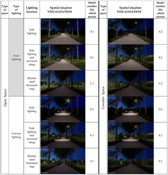 We based the study on experimentation involving intra-group factorial planning, whereby the respondents would evaluate the park landscapes presented in the visualisations according to five dimensions: preference, safety, legibility, mystery, and contact with the environment. The visualisations differed in terms of spatial features, which constituted predictors (independent variables): lighting location, lighting distribution, and type of space. The assessment was performed separately by two groups—people with physical disabilities and people without. As a result, we used a four-factor mixed scheme 2 × (2 × 3 × 2): 2 (groups: disabled, able-bodied) × 2 (light distribution: even, uneven) × 3 (lighting location: paths, paths + surroundings, surroundings) × 2 (space: open, corridor). The research plan is presented in Figure 1.
