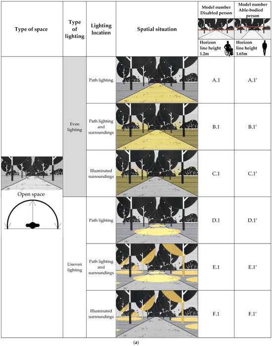 Next, we added lighting in six variants according to the research scheme (Figure 1). In the first variant, the landscape was illuminated evenly, while the lighting location was different (path lighting vs. path and surrounding lighting vs surrounding lighting). In the second variant, the landscape was illuminated unevenly and the lighting location was differentiated analogously to the first variant.