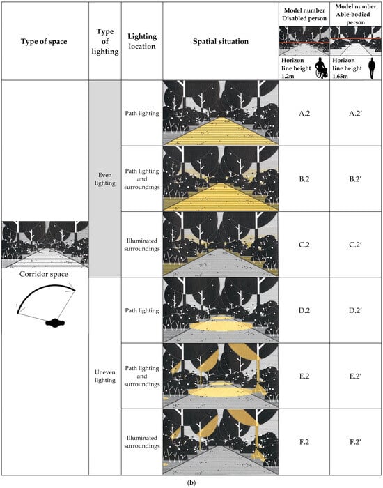 (a) Graphical diagram showing the research plan for the open space (perspective and arrangement of lighting for a disabled person moving in a wheelchair and able-bodied person). (b) Graphical diagram showing the research plan for the corridor space (perspective and arrangement of lighting for a disabled person moving in a wheelchair and able-bodied person).
