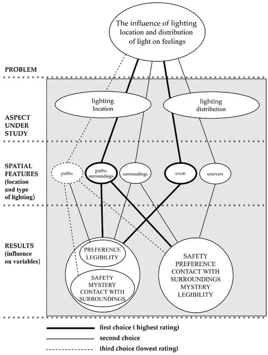 In summary, uniform lighting was rated higher than nonuniform lighting in all the conditions—in all the dimensions (variables). Furthermore, the respondents generally rated the path lighting scenes with ambient lighting the highest. Other lighting variants differed for individual variables, as illustrated by the hierarchical diagram showing the respondents’ ratings for the different conditions (Figure 4).