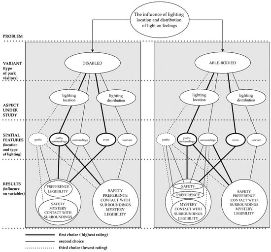 The opposite assumption can be made by analysing the need for safety based on a concept proposed by Fisher and Nasar [36], which proposes that this feeling arises from three factors: view of the surroundings (and the related potential control over the situation), places of concealment (offering the possibility to hide), and the chance of escape. While there is no evidence to suggest that the first two factors may be experienced differently by able-bodied and disabled people, the third factor may evoke varied reactions. A person in a wheelchair has such limited mobility that the question of escape probably does not play a major role in their assessment of safety. On the other hand, an able-bodied person may assess path lighting as relevant for escape, and this may have a stronger impact on their sense of safety than the lighting of the surroundings. A disabled person, disregarding the possibility of escape, may consider lighting of the surroundings as more important. Indeed, this would be more conducive to appraising safety [51] by offering a more effective and earlier chance to spot a potential threat.