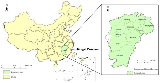 As a significant rice-growing area in China, Jiangxi Province not only has a long history of rice cultivation but is also known for its extensive planting area, high yields, and high-quality rice. Since different Jiangxi Province regions have differences in climate and soil, a diverse demand exists for rice technology. This makes Jiangxi Province an ideal place to study the adaptability of different technologies and the match between farmers’ needs and technology extension strategies. The government of Jiangxi Province has provided robust support for agricultural technology extension and has actively worked to create a policy environment conducive to this extension. This support has had a significant demonstration effect and a broad influence on disseminating agricultural technology. Therefore, selecting Jiangxi Province’s rice farmers as the research sample helps uncover the underlying motivations behind farmers’ behavior and provides valuable insights for enhancing the production efficiency of farmers and optimizing the promotion strategy of green production technology. The research area is shown in Figure 2.