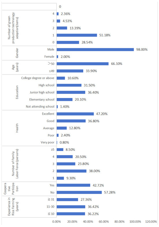 In this study, the distinct dimensions of the sample structure were analyzed in depth through descriptive statistical analysis, and the relevant results are indicated in Figure 3. The analyzed data demonstrated that the intensity of green production technologies adoption illustrated an apparent non-uniform distribution among farmers. There is the highest proportion of farmers having adopted just one technology, at 51.18%, highlighting the ‘threshold’ phenomenon in technology adoption [29], and the ratio of farmers having adopted four technologies merely accounts for 2.36%, which further highlights that technology adoption depth in various farmer groups has great differences. This study was based on household heads, and the proportion of male heads of households was as high as 98 percent. In addition, the formation of this phenomenon is not accidental; it represents a finding of intertwined influences of several factors. Probing from the ideological and cultural level, Confucianism profoundly influences Chinese society, underscoring traditional family structures and gender roles. In this cultural context, men are typically regarded as the family’s economic pillars and decision-making core. As a result, they have more of a chance to assume the role of head of household within the family. Regarding age composition, over half of the respondents were 50 or older, indicating the aging trend within China’s agricultural labor force. Regarding educational attainment, 57.50 percent of the respondents had a junior high school education or below. This proportion suggests that the widespread adoption of green production technologies cannot be separated from the overall education of farmers. Regarding health status, this sample of farmers were generally in good physical condition, providing a solid foundation for successful technology adoption. The percentage of farmers participating in professional rice cooperatives reached 42.72 percent, which implies that cooperatives play an active role in technology promotion.
