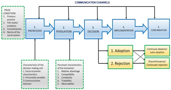 The information acquisition channel involves the exposure of individuals or entities (firms, organizations, etc.) to the existence of an innovation without having an in-depth knowledge of how it works. Such a channel uses mass media to spread awareness about innovation to audiences on a broad spectrum. Once the basic knowledge is obtained, individuals propagate to the persuasiveness channel through which they can conceptualize opinions in favor or against the innovation. Using this channel, individuals carry out discussions with peer groups (colleagues, friends, relatives, family members, and leaders) to obtain a deeper understanding of the benefits and drawbacks of the innovation. After grasping a sufficient level of understanding of the innovation, individuals and other entities decide to accept or reject the innovation based on its compatibility with their requirements. In this channel, trials of innovation, personal experiences, and pilot and demonstration programs are effective in shaping acceptance or rejection decisions. As the adopters reach the application stage and start using the innovation, they might face certain technical challenges that could be resolved by providing technical support from experts, as well as innovation providers. Finally, innovation adopters revisit their adoption decision by seeking whether the innovation is suitable in their specific context. Herein, their satisfaction will confirm their continuous use of the innovation, while their dissatisfaction might lead to dis-adoption behavior.