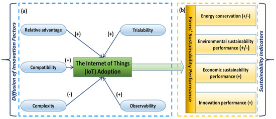 The current body of knowledge on digital transformation, particularly in terms of the adoption of the Internet of Things (IoT) technology, is focused on examining the determinants of IoT utilization within a diverse range of theoretical frameworks [37,38,39,40,41,42]. Nevertheless, none of them opted for Rogers’ diffusion of innovation modeling (DIM) framework [61] to investigate those determinants of IoT adoption. Moreover, there is a limited amount of empirical evidence that establishes a connection between digital transformation and the sustainability performance of firms using several metrics [8,21,62,63]. In this regard, there is a lack of research on the influence of IoT implementation on the sustainability performance of small and medium-sized firms (SMFs) captured through their spending on environmentally friendly, energy-efficient, and innovative activities. Some research works have examined the effects of digital transformation on firm revenue and profitability [22,64,65]. However, none of these studies have specifically investigated the influence of IoT technology on firms’ economic sustainability behavior. In particular, no previous study has been found to capture such an impact through the metric of SMFs’ access to credits.