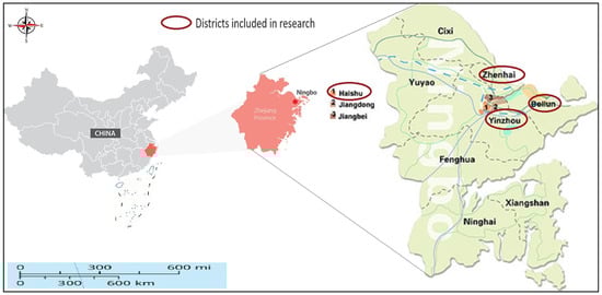 This study included conducting a survey questionnaire from May to June 2024 in four districts (Zhenhai, Beilun, Haishu, and Yinzhou) of Ningbo City in Zhejiang Province, China. Please refer to Figure 3 for the research location. Ningbo is a significant sub-provincial city located in the northeastern region of Zhejiang Province. This city, situated in the southern commercial hub of the Yangtze River Delta, has always had a significant position in international commerce due to its historic and financial significance. The Port of Ningbo-Zhoushan is a highly advanced and efficient deep water port that combines inland, estuary, and seaport operations. It has the world’s highest cargo throughput and the world’s third-largest container volume, making it a versatile and comprehensive facility. As to the data from the Ningbo Bureau of Statistics, Ningbo’s regional gross domestic product (GDP) reached RMB 1.57 trillion (about USD 214.59 billion) in 2022, indicating a growth of 3.5% compared to 2021, whereas the per capita GDP was RMB 163,911 (about USD 22,403). Ningbo is rated 12th among China’s 300 cities in terms of business environment. The city has a robust and concentrated industry cluster specializing in innovative manufacturing. The manufacturing sector in the city saw a 3.3% rise from the previous year in its value addition, reaching about RMB 668.117 billion (around USD 91.31 billion) in 2022.