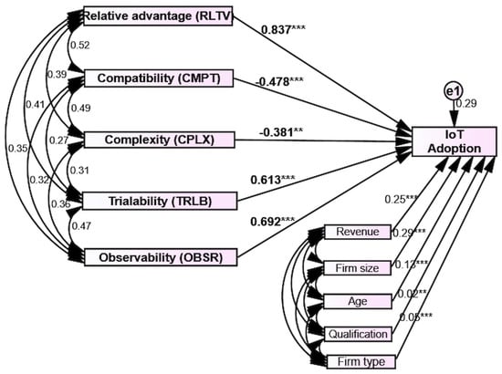 - The relative advantage of the IoT refers to the level at which the IoT is considered superior to traditional manual options. The progression of the use of the IoT depends on the level of relative advantage it offers. To illustrate, by utilizing real-time data from connected devices, firms are able to make data-driven decisions that increase their decision-making process, optimize operational efficiency, reduce waste, and enhance the quality of their products. This results in a notable benefit in areas such as operational effectiveness and customer contentment [98]. Regarding distinction through innovation, IoT technology has the potential to generate novel opportunities for the creation of products. Firms can develop inventive, data-centric goods and services that meet changing client needs and address environmental issues [99]. Emphasizing sustainability and efficiency can serve as a crucial factor that sets us apart from competitors in the marketplace. The IoT facilitates enhanced operational visibility by providing a comprehensive perspective of operations, allowing companies to discover areas of congestion, anticipate equipment malfunctions, and optimize the allocation of resources. The increased visibility leads to a competitive edge by enhancing responsiveness, accelerating turnaround times, and lowering production expenses [100]. Given these arguments, the following relationship can be hypothesized: