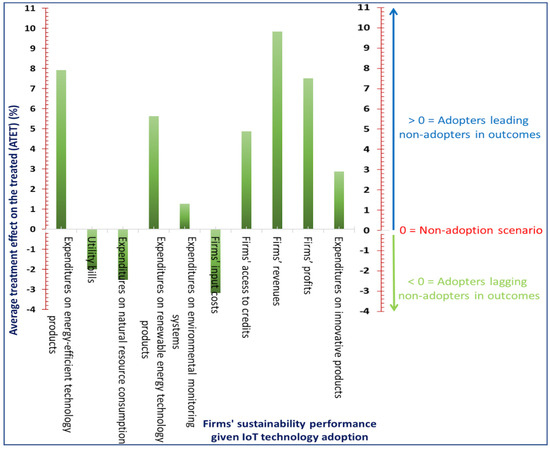 In addition, this study utilized the propensity score matching (PSM) technique to examine the impact of IoT adoption on firms’ sustainability performance. When doing statistical evaluation, it is important to take into account the key distinguishing characteristics between the various categories. This is necessary to address possible errors in estimating, such as self-selection and explicit biases. The current investigation employs a matching strategy to address the biases that arise from the variations in observable characteristics between the control and treatment categories. In order to facilitate comparisons, individuals who utilize the IoT and those who do not are evaluated based on various discernible characteristics. At first, the matching implies that the categories being analyzed contain disparities in traits that cannot be directly observed. The matching procedure considers all discernible characteristics of both adopters and non-adopters of the IoT. Nevertheless, incorporating a growing variety of factors diminishes the likelihood of finding a suitable match [125]. The escalation of the categories’ matching characteristics significantly amplifies the seriousness of the issue by expanding the number of matched dimensions, a phenomenon referred to as the dimensionality curse [126]. Utilizing the PSM method can resolve this problem [127]. The PSM method compares the characteristics of every treatment individual (consumer) to those of someone in the untreated group (control) who has similar characteristics. This is done to produce a match score rather than simply juxtaposing the predefined parameters. The PSM establishes a controlled category that exhibits visible characteristics that are comparable to the persons receiving treatment. As a result, it effectively reduces the risk of encountering a “dimensionality curse” by generating a distinct matched score.