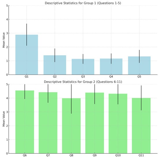 - Variable Coding: As shown in Table 1, all survey responses were coded numerically, and the data were entered into IBM SPSS Statistics v. 29. Questions 1–5, which focused on technicians’ opinions on professional experience and evaluations, were measured on an ordinal scale and were appropriately coded. Similarly, Questions 6–11, which used a 5-point Likert scale, were also coded as ordinal variables.