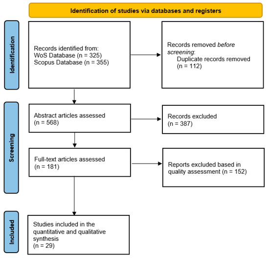 We followed the recommendations of Bramer et al. [20] and Heck et al. [21] to adopt two scientific databases with high credibility and international reputation: Web of Science (WoS) and Scopus. When PRISMA was first carried out, we were careful to identify and remove published articles by their DOI. Other scientific databases associated with commercial publishers (e.g., ERIC, ACM, PubMed, PsycINFO, and ScienceDirect) were not considered because these databases are not as complete and, in most cases, they include articles previously indexed in WoS or Scopus. Google Scholar was not considered because it may include gray studies [22]. Additionally, this study did not employ registers and, therefore, the entire data search process was performed directly in the WoS and Scopus databases.