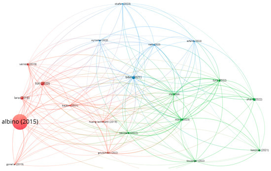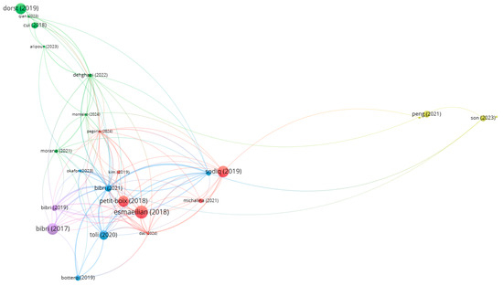 Figure 5 and Figure 6 aim to respond to RQ2 considering the topics of smart cities and sustainable cities, respectively. To perform this analysis, we conducted bibliographic coupling. This is a method used in bibliometric analysis to measure the relatedness of documents based on the number of shared references. Two documents are bibliographically coupled if they cite one or more documents in common. The strength of the coupling is determined by the number of shared references: the more references two documents share, the more strongly they are coupled [36]. Only three clusters were identified for smart cities, while five clusters were identified for sustainable cities. The number of documents in each cluster can indicate the prominence of a particular research theme. Larger clusters emerging in sustainable cities suggest more extensive research activity. Moreover, the density of connections within a cluster reflects how closely related the documents are. High density indicates a well-defined research area with many interrelated studies, as is the case in the smart cities topic.