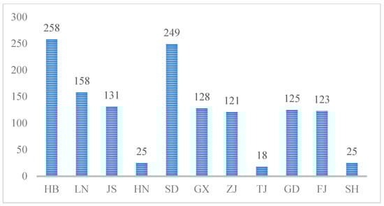 Number of CDM projects in coastal provinces. Note: HB represents Hebei Province, LN represents Liaoning Province, JS represents Jiangxi Province, HN represents Henan Province, SD represents Shandong Province, GX represents Guangxi Zhuang Autonomous Region, ZJ represents Zhejiang Province, TJ represents Tianjin, GD represents Guangdong Province, and FJ represents Fujian Province. SH represents Shanghai City.