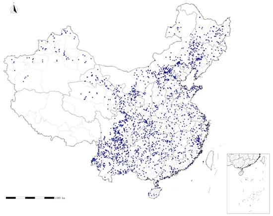 Geographical location of new energy CDM projects in China. Note: The black dots represent new energy CDM projects in less developed coastal cities, and the blue dots represent new energy CDM projects in other cities.