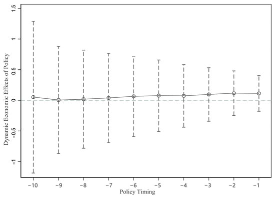 Parallel trend test. Note: The hollow circles in the figure represent the dynamic economic effect coefficients, while the dashed lines indicate the 95% confidence intervals for these coefficients.